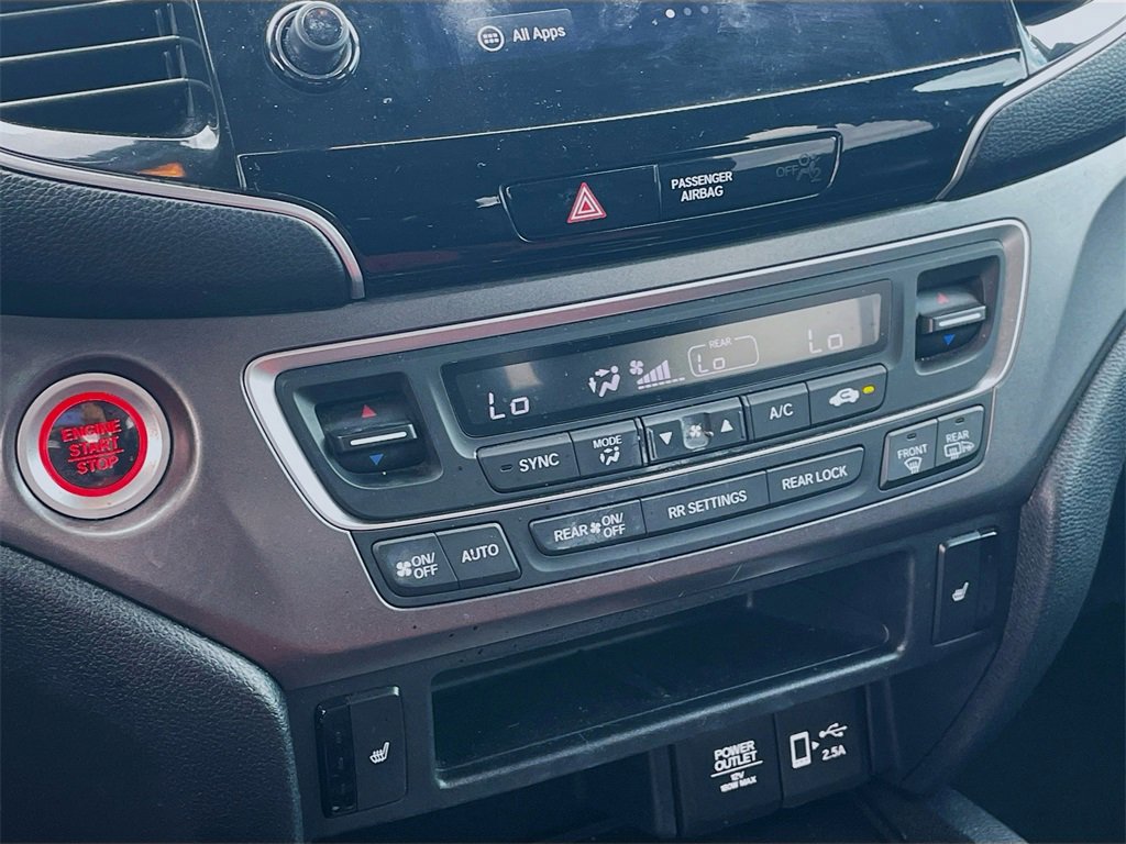 18 Machine-Finished Alloy Wheels, 3rd row seats: split-bench, 4-Wheel Disc Brakes, 4.25 Axle Ratio, 7 Speakers, A/V remote: CabinControl, ABS brakes, Air Conditioning, Alloy wheels, AM/FM radio: SiriusXM, Apple CarPlay/Android Auto, Auto High-beam Headlights, Auto-dimming Rear-View mirror, Automatic temperature control, Blind Spot Information (BSI) System warning, Brake assist, Bumpers: body-color, Delay-off headlights, Driver door bin, Driver vanity mirror, Dual front impact airbags, Dual front side impact airbags, Electronic Stability Control, Emergency communication system: HondaLink Assist, Exterior Parking Camera Rear, Forward collision: Collision Mitigation Braking System (CMBS) + FCW mitigation, Four wheel independent suspension, Front anti-roll bar, Front Bucket Seats, Front Center Armrest, Front dual zone A/C, Front fog lights, Front reading lights, Fully automatic headlights, Garage door transmitter: HomeLink, Heated door mirrors, Heated Front Bucket Seats, Heated front seats, Illuminated entry, Lane departure: Lane Keeping Assist System (LKAS) active, Leather Seat Trim, Leather Shift Knob, Low tire pressure warning, Memory seat, Occupant sensing airbag, Outside temperature display, Overhead airbag, Overhead console, Panic alarm, Passenger door bin, Passenger vanity mirror, Power door mirrors, Power driver seat, Power Liftgate, Power moonroof, Power passenger seat, Power steering, Power windows, Radio data system, Radio: 215-Watt Audio System, Rear air conditioning, Rear anti-roll bar, Rear reading lights, Rear seat center armrest, Rear window defroster, Rear window wiper, Reclining 3rd row seat, Remote keyless entry, Security system, Speed control, Speed-sensing steering, Speed-Sensitive Wipers, Split folding rear seat, Spoiler, Steering wheel mounted audio controls, Tachometer, Telescoping steering wheel, Tilt steering wheel, Traction control, Trip computer, Turn signal indicator mirrors, Variably intermittent wipers.