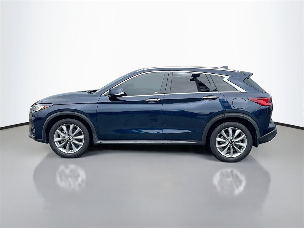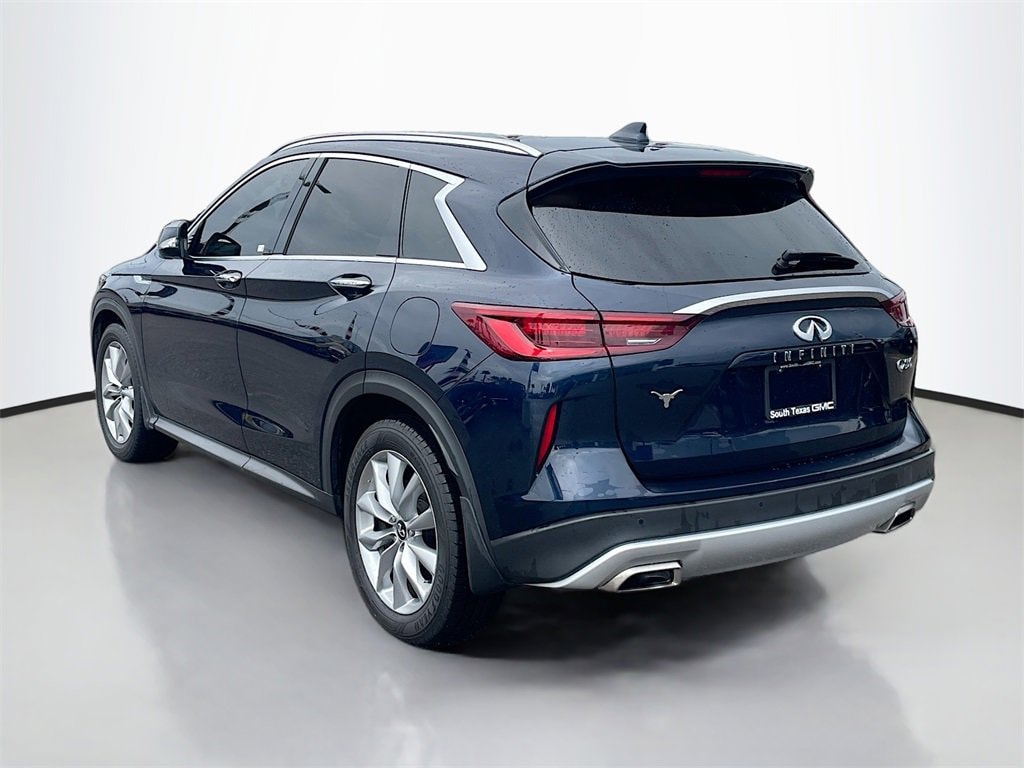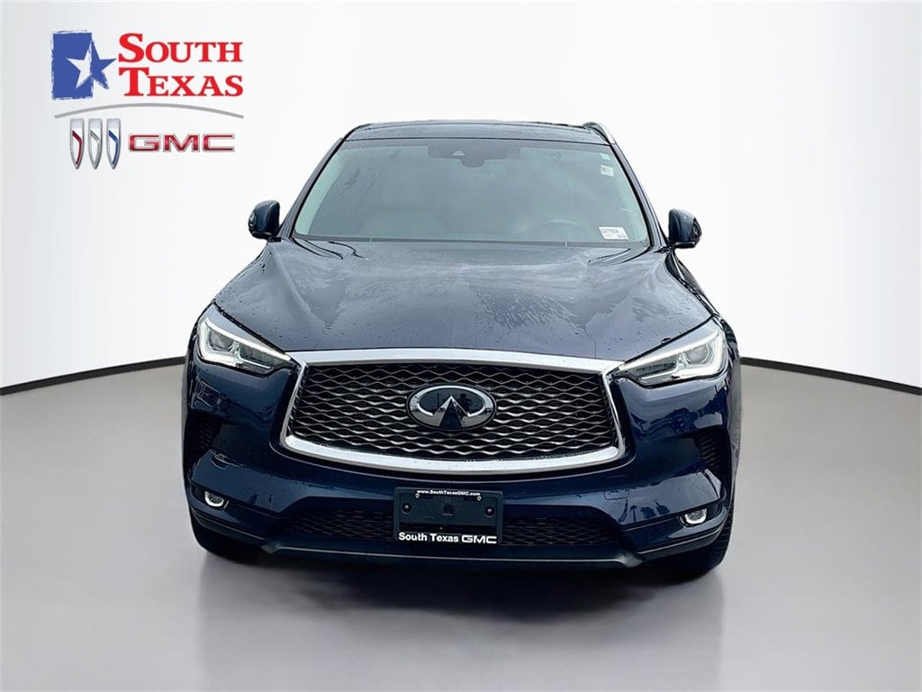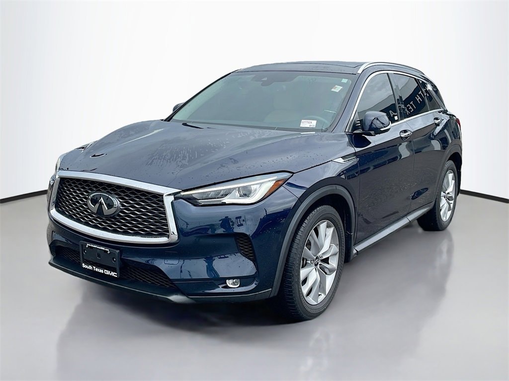 Hermosa Blue 2022 INFINITI QX50 LUXE FWD CVT I4WE ARE OPEN FOR ALL YOUR SALES AND SERVICE NEEDS! COMPLETE ONLINE BUYING EXPERIENCE AVAILABLE!CALL 956-661-5000 TO SCHEDULE YOUR CONTACT FREE TEST DRIVE TODAY!4-Wheel Disc Brakes, 5.846 Axle Ratio, 6 Speakers, ABS brakes, Air Conditioning, Alloy wheels, AM/FM radio: SiriusXM, Anti-whiplash front head restraints, Auto High-beam Headlights, Auto-dimming Rear-View mirror, Automatic temperature control, Black Splash Guards (Set of 4), Brake assist, Bumpers: body-color, CD player, Delay-off headlights, Driver door bin, Driver vanity mirror, Dual front impact airbags, Dual front side impact airbags, Electronic Stability Control, Emergency communication system: INFINITI InTouch, Exterior Parking Camera Rear, Floor Mats, Four wheel independent suspension, Front anti-roll bar, Front Bucket Seats, Front Center Armrest, Front dual zone A/C, Front fog lights, Front reading lights, Fully automatic headlights, Garage door transmitter: HomeLink, Heated door mirrors, Heated Front Bucket Seats, Heated front seats, Illuminated entry, Illuminated Kick Plates, Knee airbag, Leather Shift Knob, Leather-Appointed Seat Trim, Low tire pressure warning, Occupant sensing airbag, Outside temperature display, Overhead airbag, Overhead console, Panic alarm, Passenger door bin, Passenger vanity mirror, Power door mirrors, Power driver seat, Power Liftgate, Power moonroof, Power passenger seat, Power steering, Power windows, Radio data system, Radio: HD Audio System, Rear anti-roll bar, Rear Parking Sensors, Rear reading lights, Rear seat center armrest, Rear side impact airbag, Rear window defroster, Rear window wiper, Remote keyless entry, Security system, Speed control, Speed-sensing steering, Speed-Sensitive Wipers, Split folding rear seat, Spoiler, Steering wheel mounted audio controls, Tachometer, Telescoping steering wheel, Tilt steering wheel, Traction control, Trip computer, Turn signal indicator mirrors, Variably intermittent wipers, Welcome Lighting, Wheels: 19 Silver Painted Aluminum Alloy.Odometer is 15591 miles below market average! 23/29 City/Highway MPG